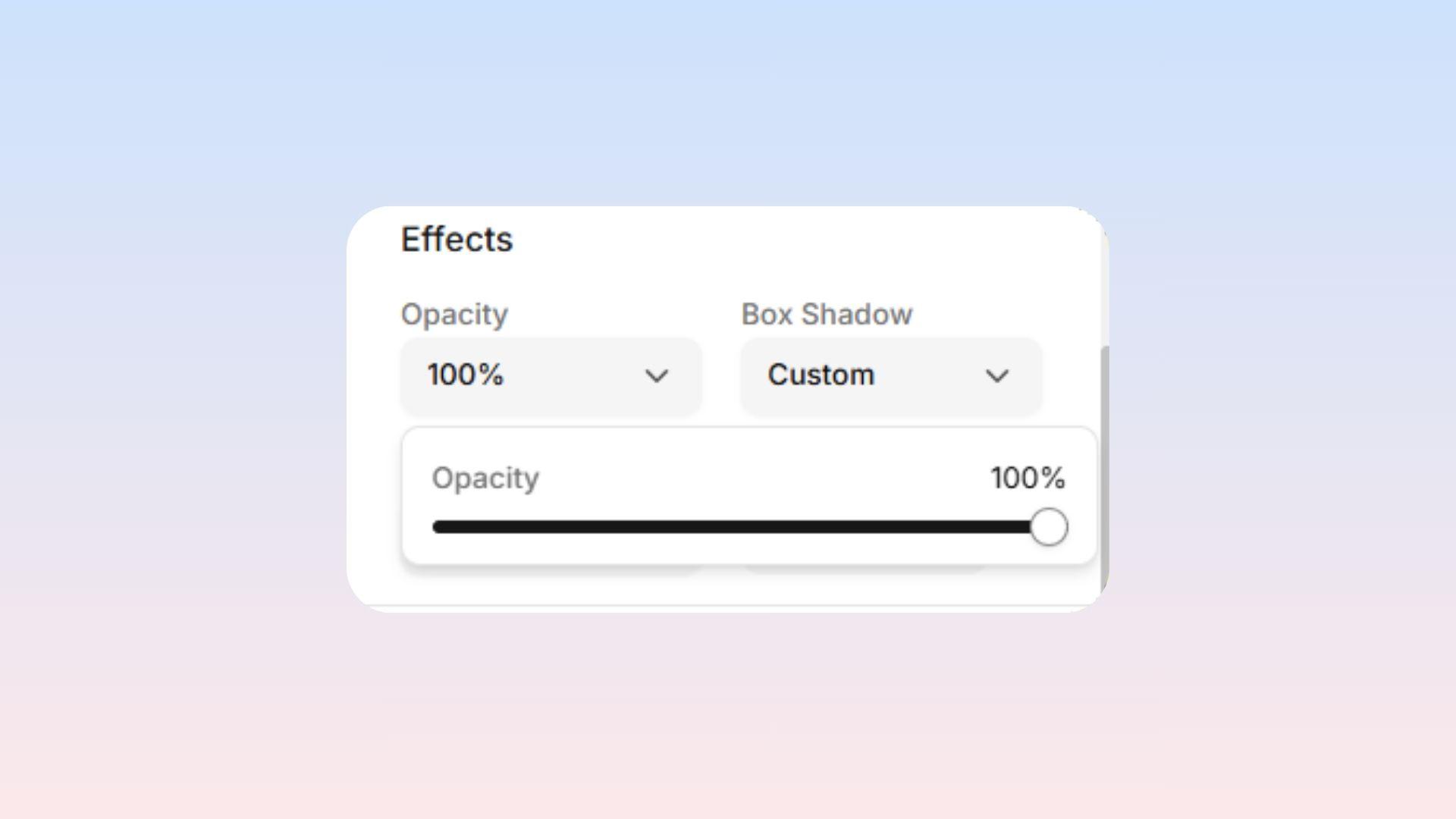 Important Note: Using this Opacity slider fades the ENTIRE item, including any text inside of it! If you ONLY want a see-through background color (but want to keep the text dark and readable), you should adjust the color settings inside the Background menu instead.