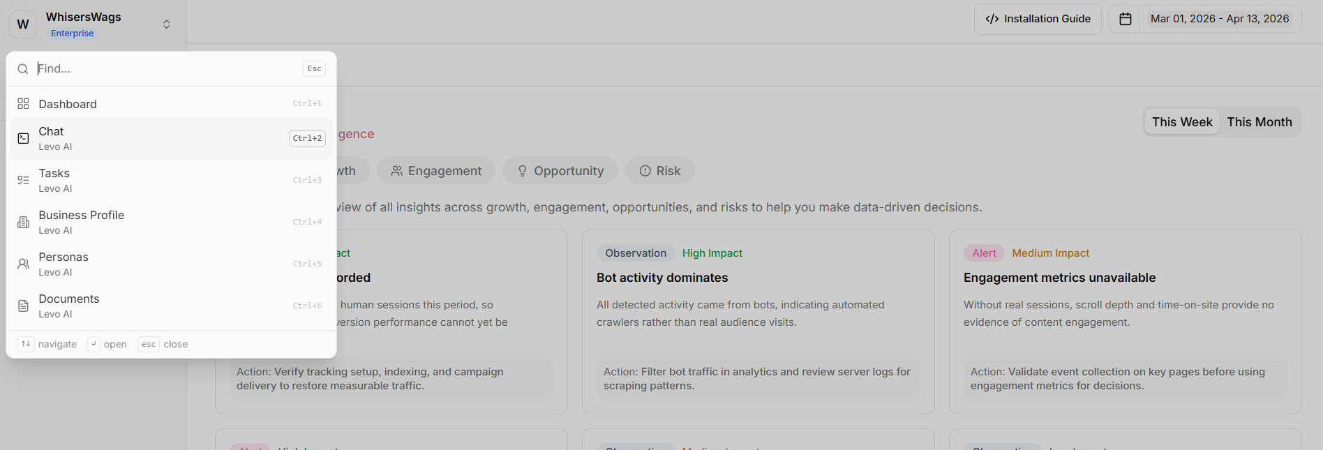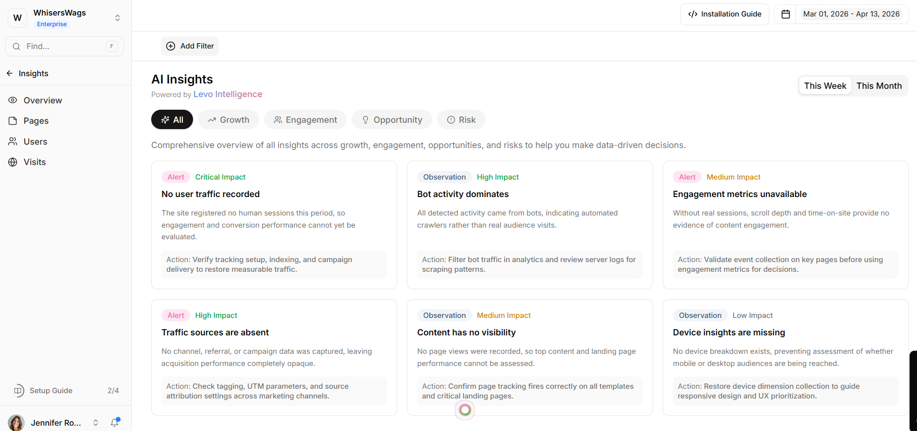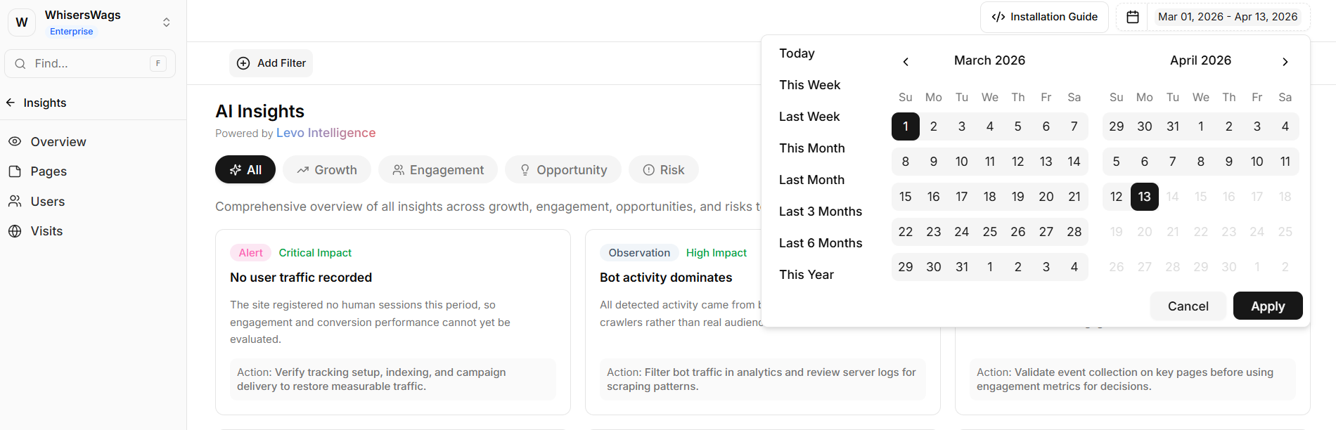 The Analytics Dashboard is the primary analytics interface within Levo Insights. It provides a high-level, real-time view of your site’s traffic, user behavior, and engagement patterns.