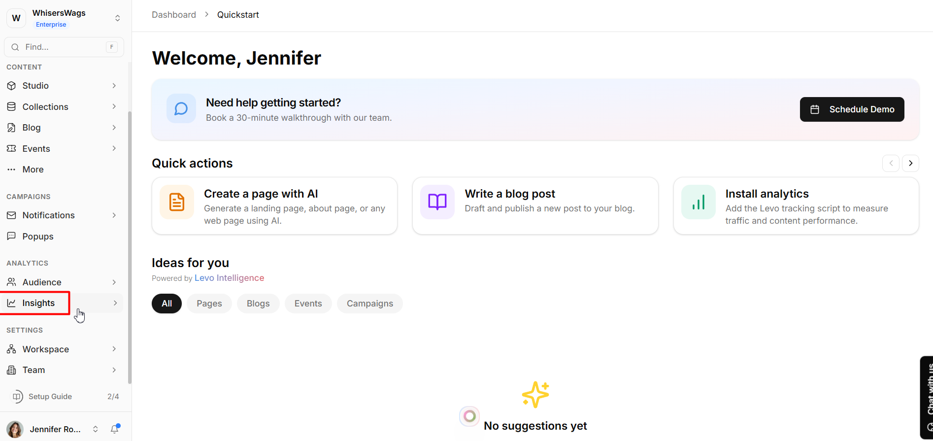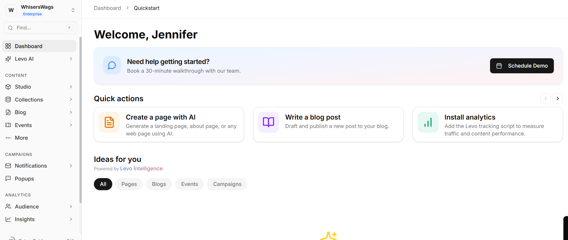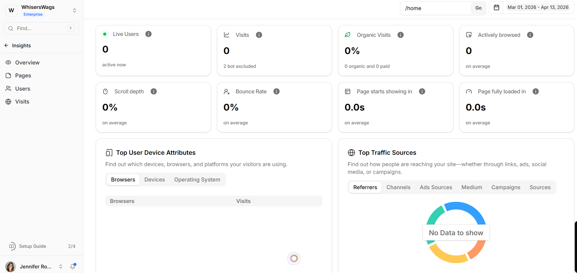 The Analytics Dashboard is the primary analytics interface within Levo Insights. It provides a high-level, real-time view of your site’s traffic, user behavior, and engagement patterns.