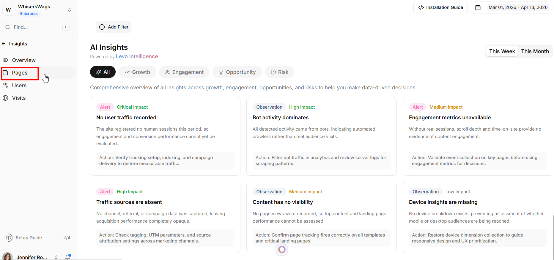 While the main Insights dashboard offers a high-level overview of your workspace, the Pages tab functions like a high-resolution microscope. It isolates performance data down to a single URL, enabling precise, in-depth content analysis.