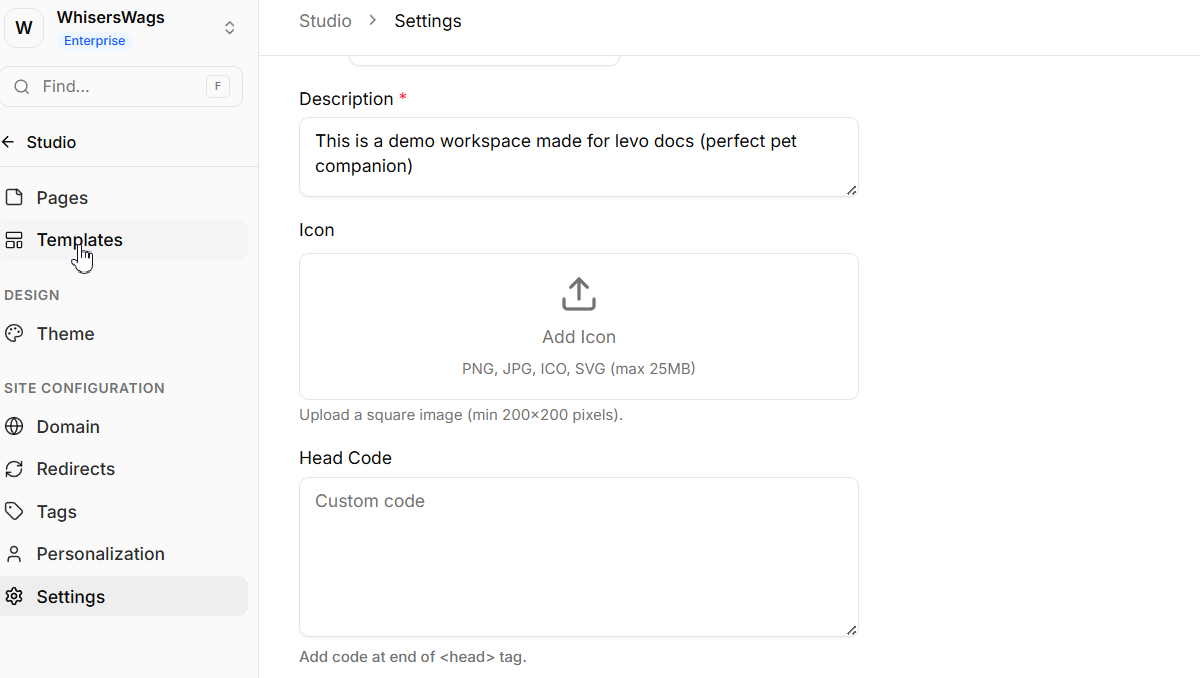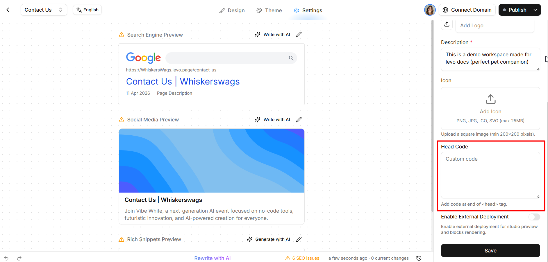 Paste in your script tag and click Save. Levo will automatically inject this into the <head> of every published page.