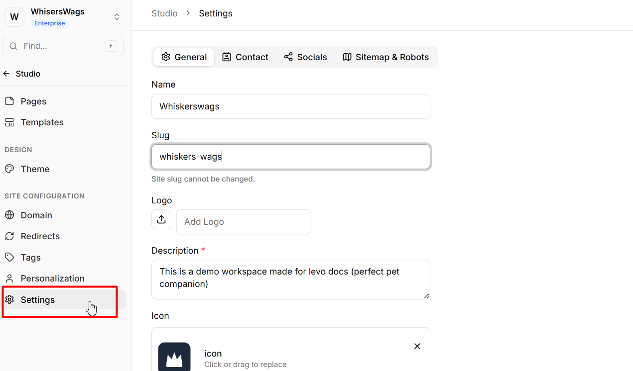 Navigate to Site Settings from the left sidebar and stay on the General tab.
