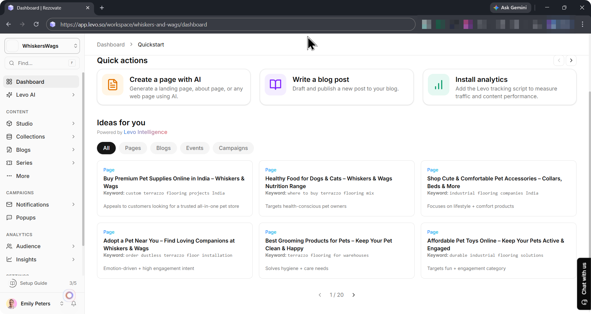 Your main screen is an idea machine. It shows a grid of new ideas made up by AI, like topics for blog posts, new events, and marketing plans.