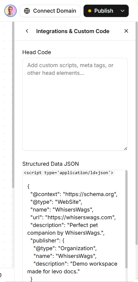 Custom Code: Advanced settings where you can add extra tracking scripts or custom code.