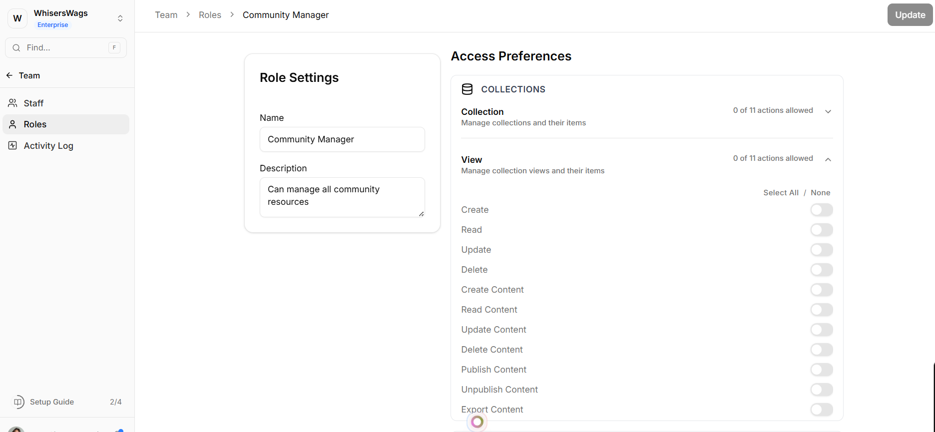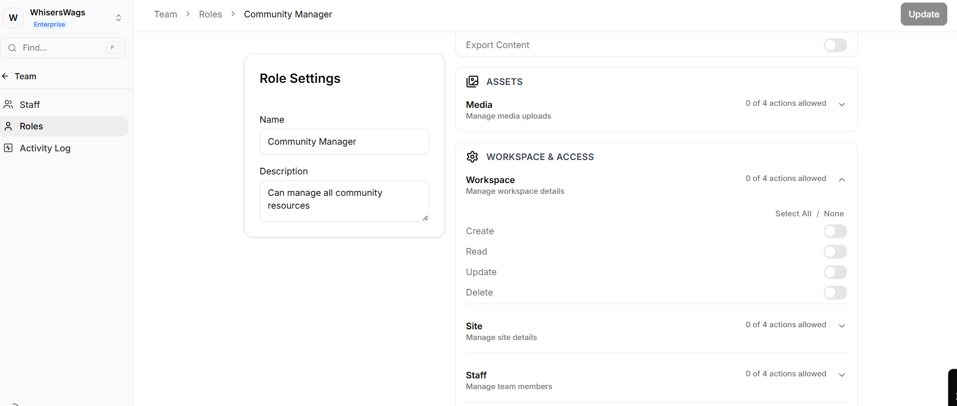 Roles & Staff: No access Allows development work while protecting administrative controls.