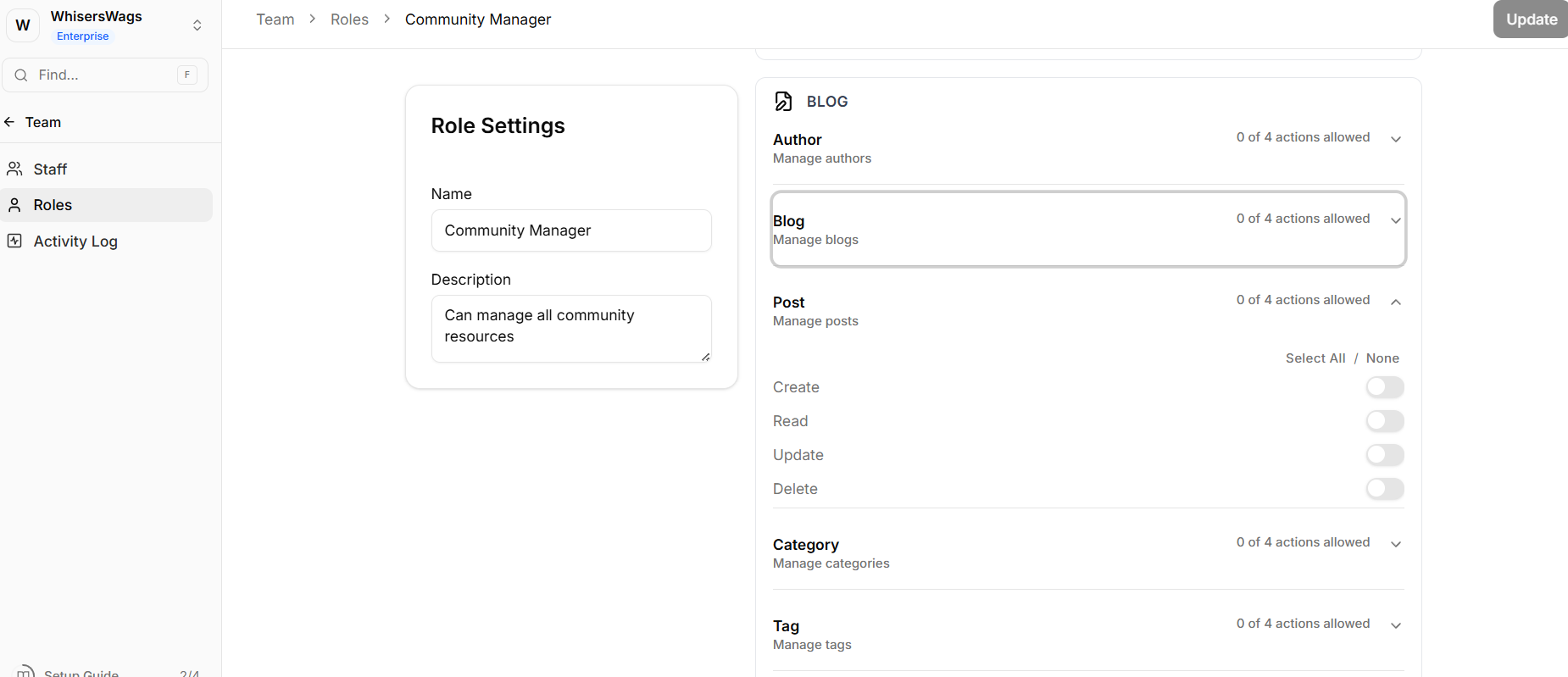 For example: The same “Blog: Create Posts” permission can be limited to a single blog (e.g., Engineering Blog), preventing access to other blogs such as Marketing Blog.