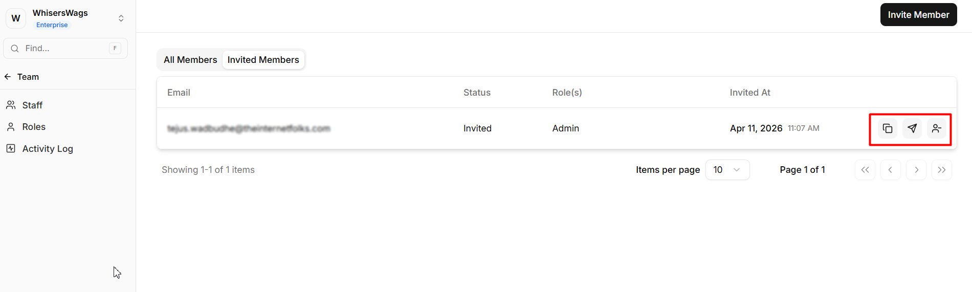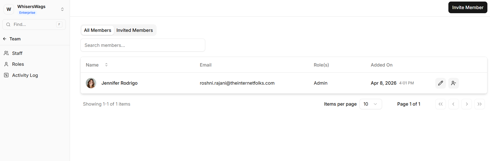 The Staff section provides workspace access management, displaying both active members and pending invitations while enabling role administration.