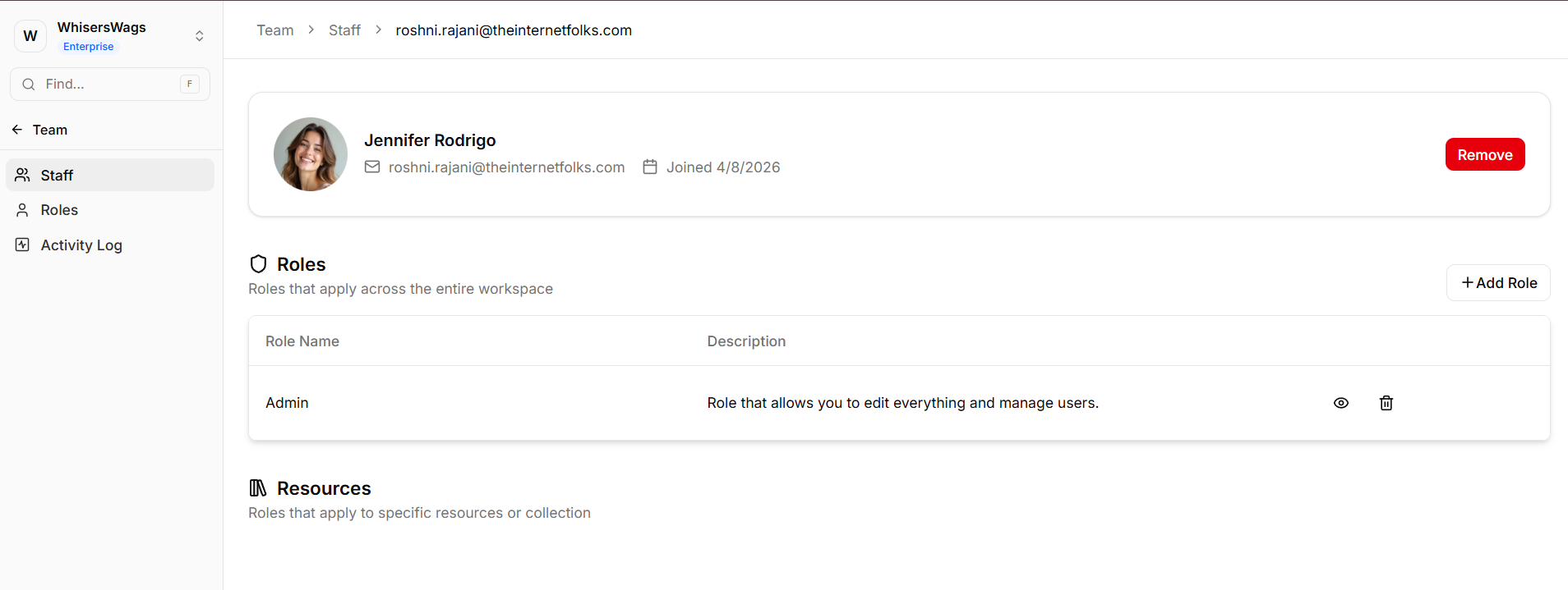 Member removal: Click the remove icon and confirm. The person immediately loses workspace access.